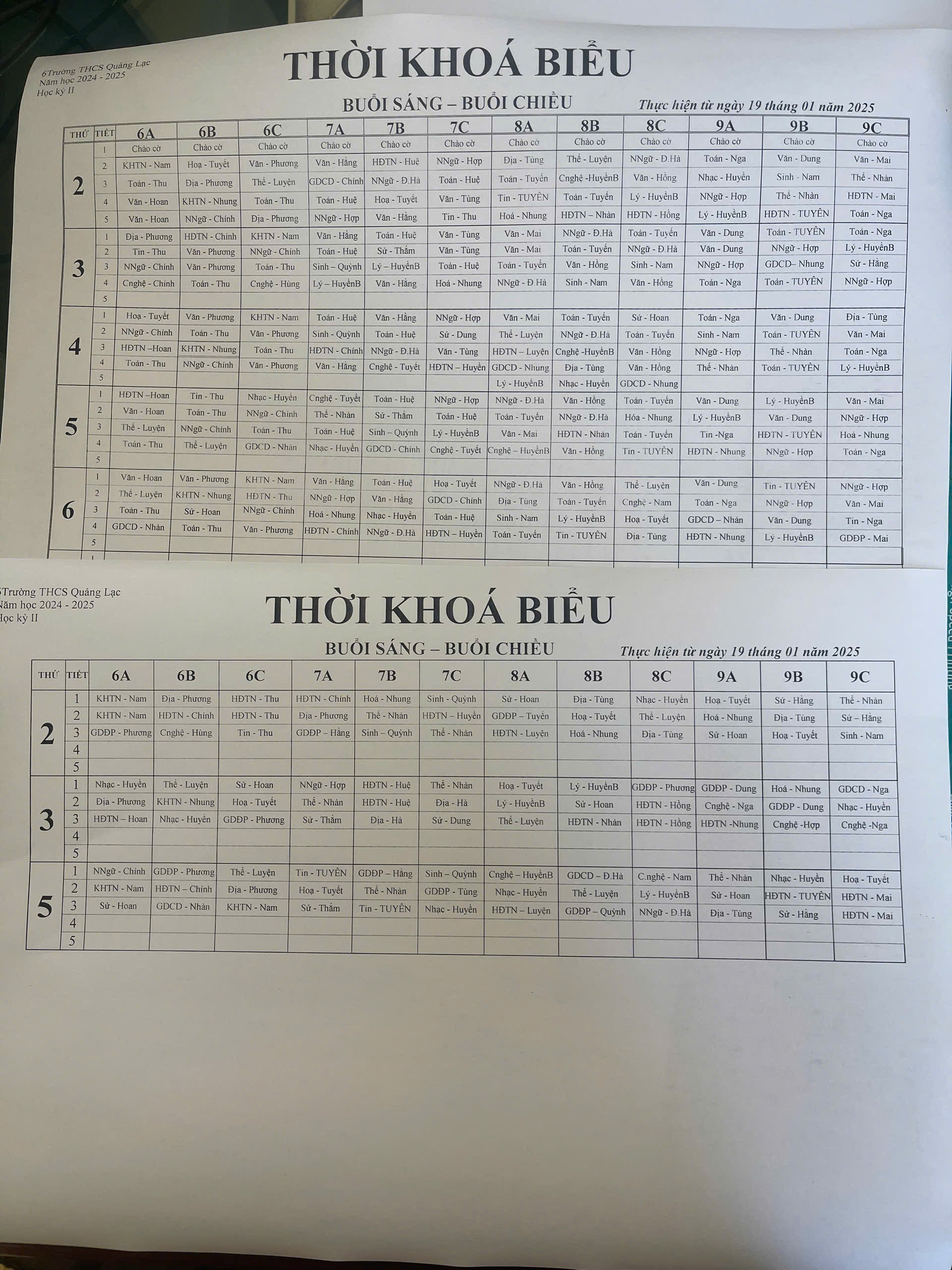 Thời khóa biểu học kì 2